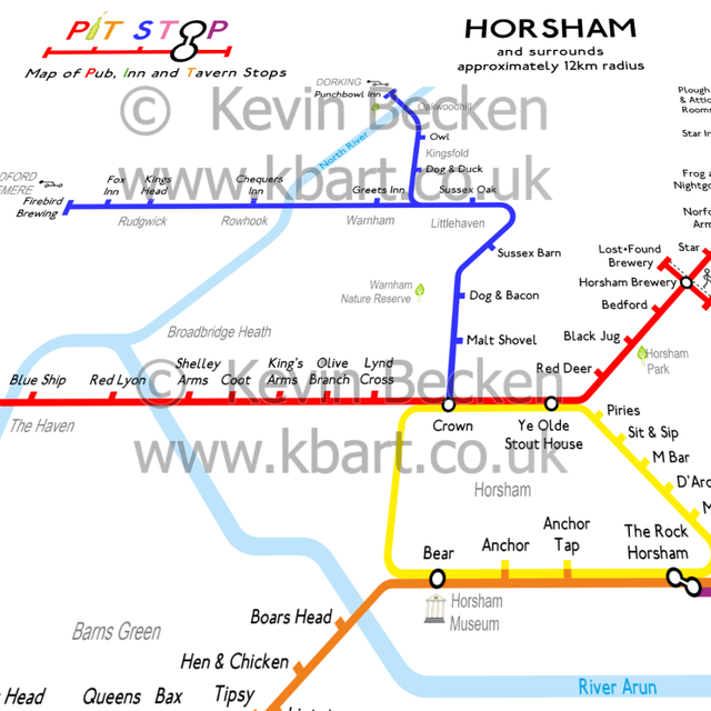 Horsham PITSTOP map of Pubs, Inns and Taverns combines my lifelong love of maps and art. I researched the pubs and bars in Horsham and surrounding radius of about 12km. I have also included some places of interest and rivers.